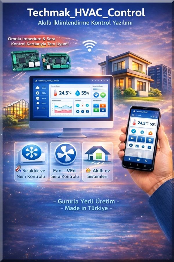 Techmak_HVAC_Control, iklimlendirme (HVAC) ve akıllı ev sistemlerini uzaktan izlemek, kontrol etmek ve yönetmek için geliştirilmiş gelişmiş bir kontrol yazılımıdır. Sistem, Techmak Omnia İmperium ve Sera kontrol kartları ile tam uyumlu olacak şekilde özel olarak tasarlanmıştır.